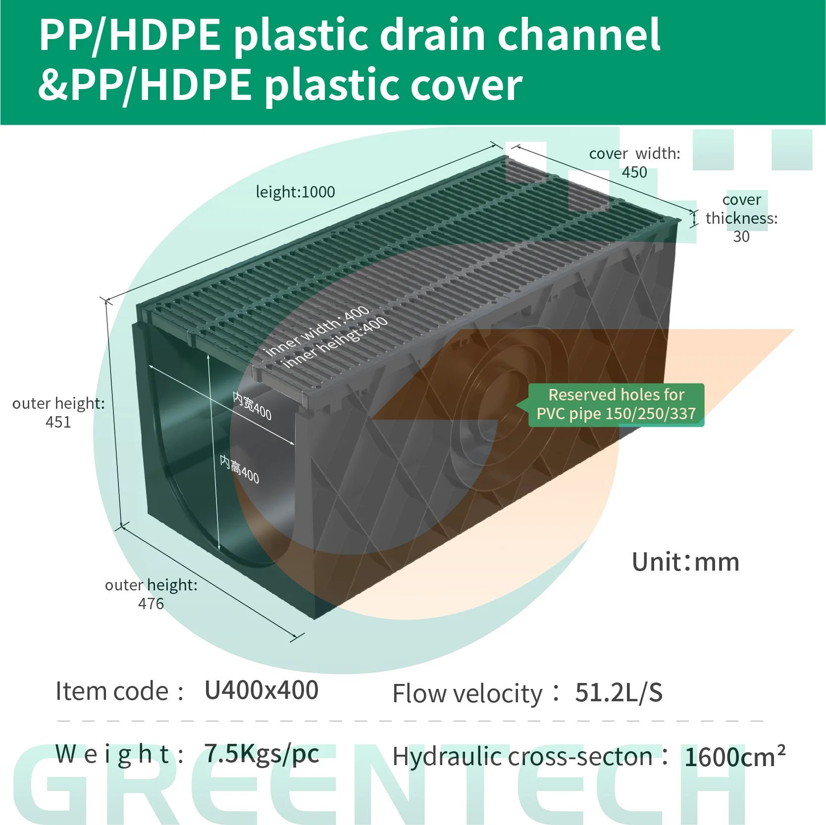 We have ID100, ID150, ID200, ID250, ID300, ID400, ID500 drain channel sizes to meet different situation, there is always one size match your requirement. and we also accept OEM order to produce customized drain channel.